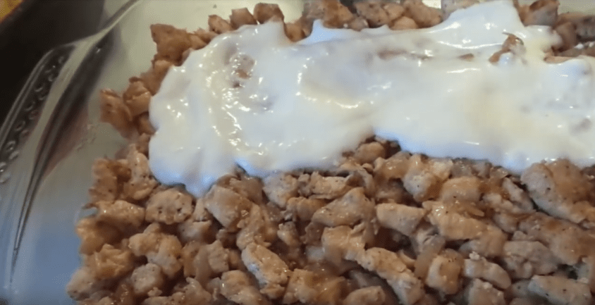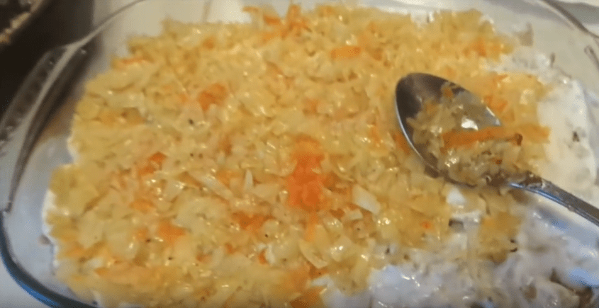 4. Следующим слоем идет курица с луком (все что приготовили), которую так же смазываем сметаной.