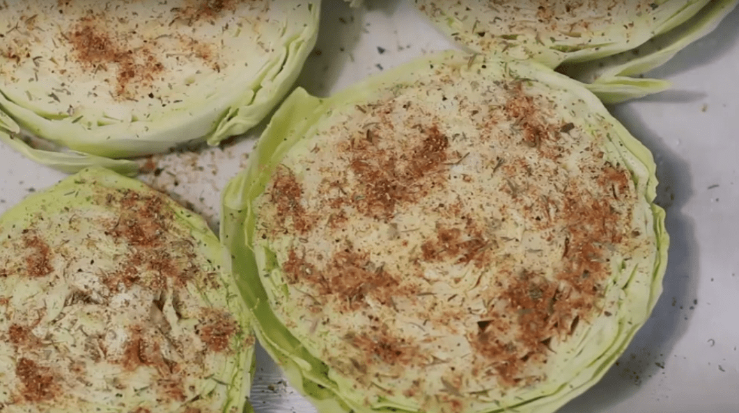 2. На противень стелим пергаментную бумагу и выкладываем капустные кольца. Щедро обсыпаем их приправами.