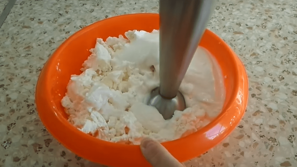 Теперь в миску с желтком добавляем крахмал, творог, сметану, ванилин и половину приготовленного сахара. Взбиваем ингредиенты блендером.
