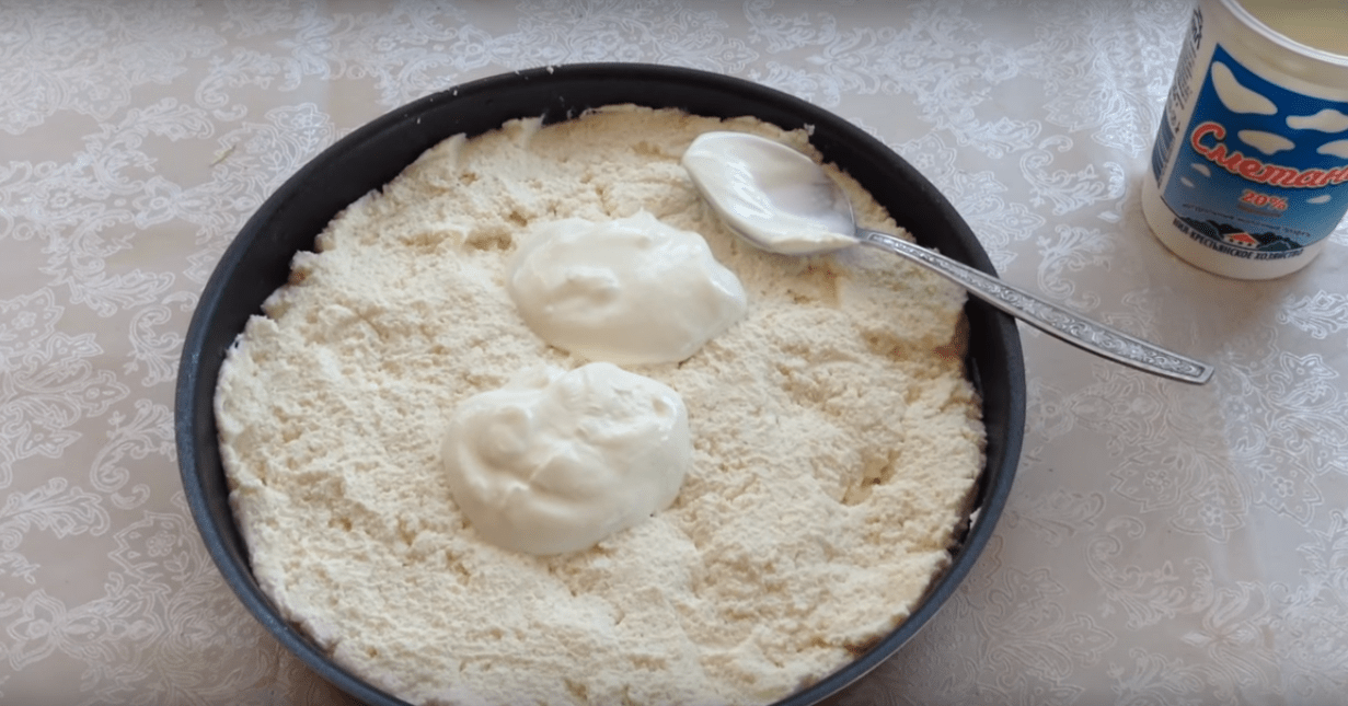 Затем выкладываем смесь в сковороду или в форму для запекания, а сверху намазываем и равномерно распределяем слой сметаны из оставшихся двух ложек сметаны.