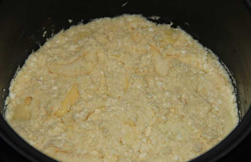 После того как эта смесь выстояла свое время, можно приступать к приготовлению теста. Для этого используем кухонный комбайн. Помещаем в него все компоненты для запеканки и смешиваем.