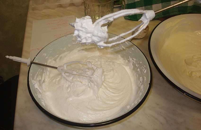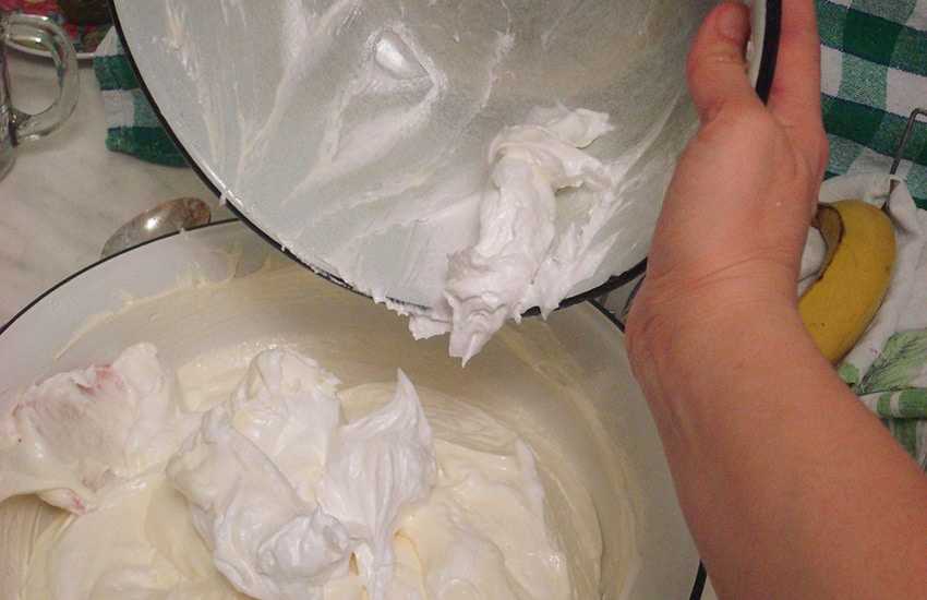 - Взбиваем белки с остатками сахара в устойчивую пену и аккуратно соединяем с творожной массой.