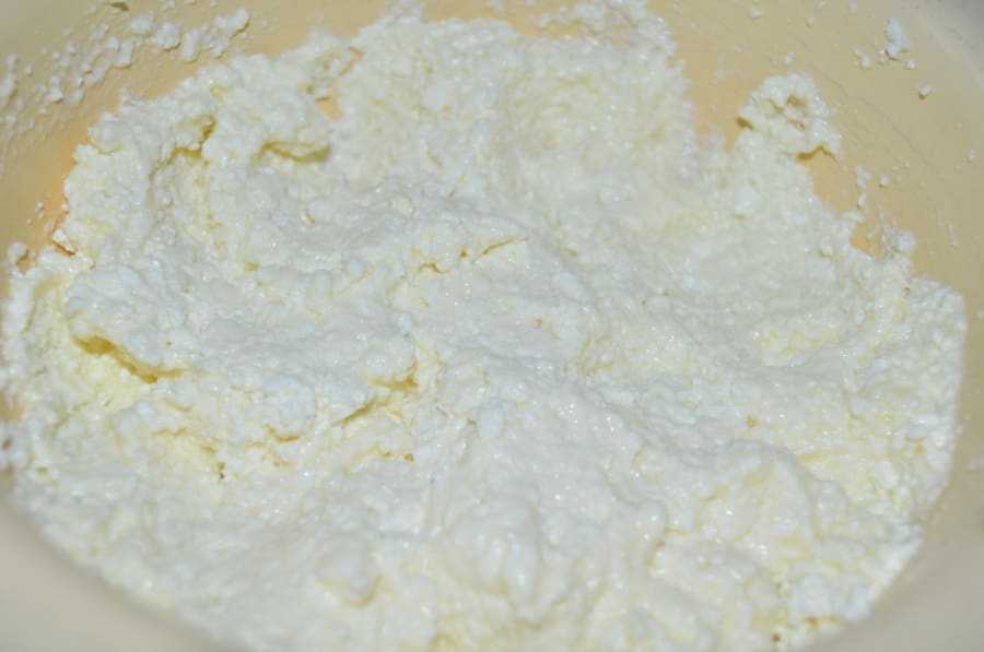 - Для начинки до однородности смешайте творожный продукт с яйцом и двумя видами сахара.