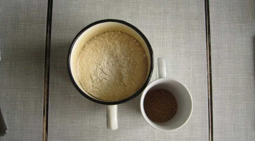 - В теплом молоке разведите дрожжи, 140 г муки и 60 г сладкого песка.