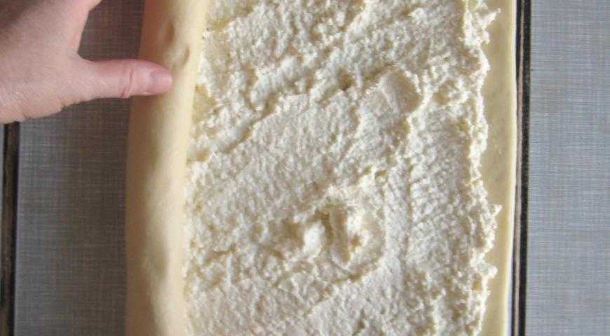 Намажьте поверхность теста творожной начинкой, оставьте с одного края пустое место около 3-4 см.