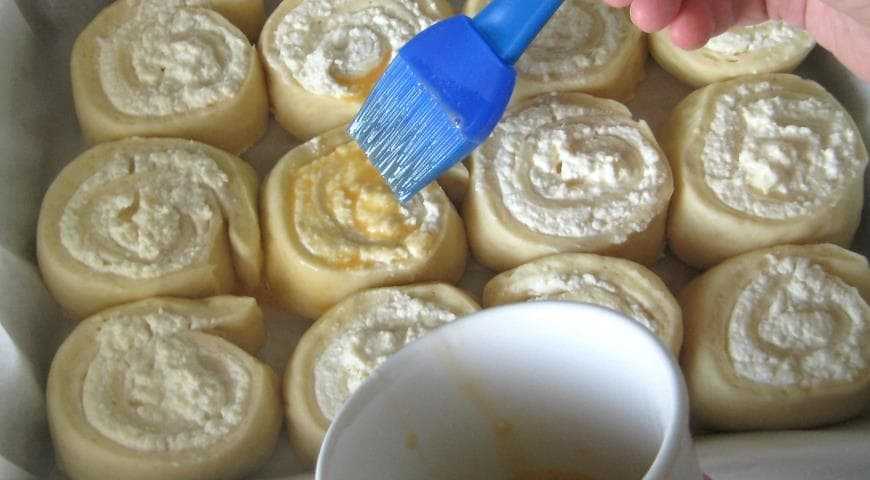 Булочки накройте и оставьте на расстойку на полчаса. Затем булочки смажьте слегка взбитым яйцом.