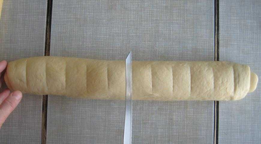 Заверните тесто в рулет, край защипните. Нарежьте рулет на равные части (получается около 12-13 булочек). Удобно это делать при помощи сантиметровой ленты, чтобы все кусочки получались одинаковые.
