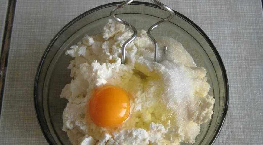 - Яйца взбейте с сахаром и добавьте творог. Перемешайте.