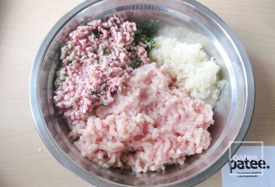 Соедините в глубокой миске прокрученный с луком куриный фарш и кусочки рубленой говядины, вбейте сырое куриное яйцо. Добавьте мякиш белой булки, размоченной в молоке или сливках. Туда же отправьте горсть фисташек. Добавьте соль и черный молотый перец, сушеный тимьян.