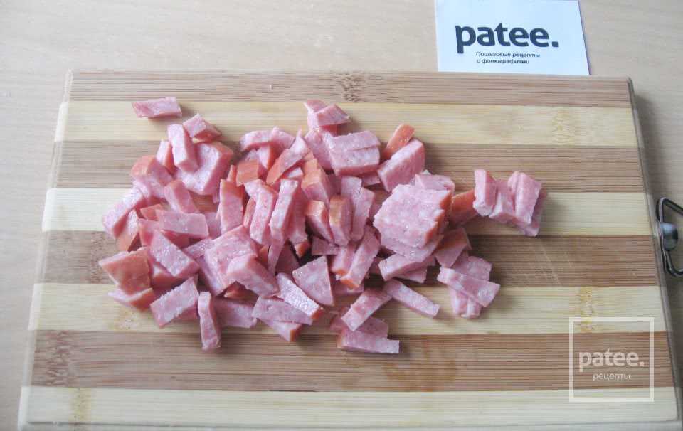 150 грамм ветчины(сервелата) нарезать кубиками.