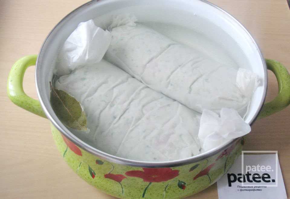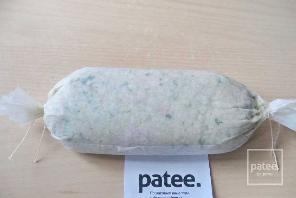 Свернуть батон с бумагой в форме конфеты. Концы перевязать ниткой или шпагатом. Можно перевязать и весь батон. Но я готовила это блюдо уже не один раз и при варке батон прекрасно сохраняет форму без шпагата.