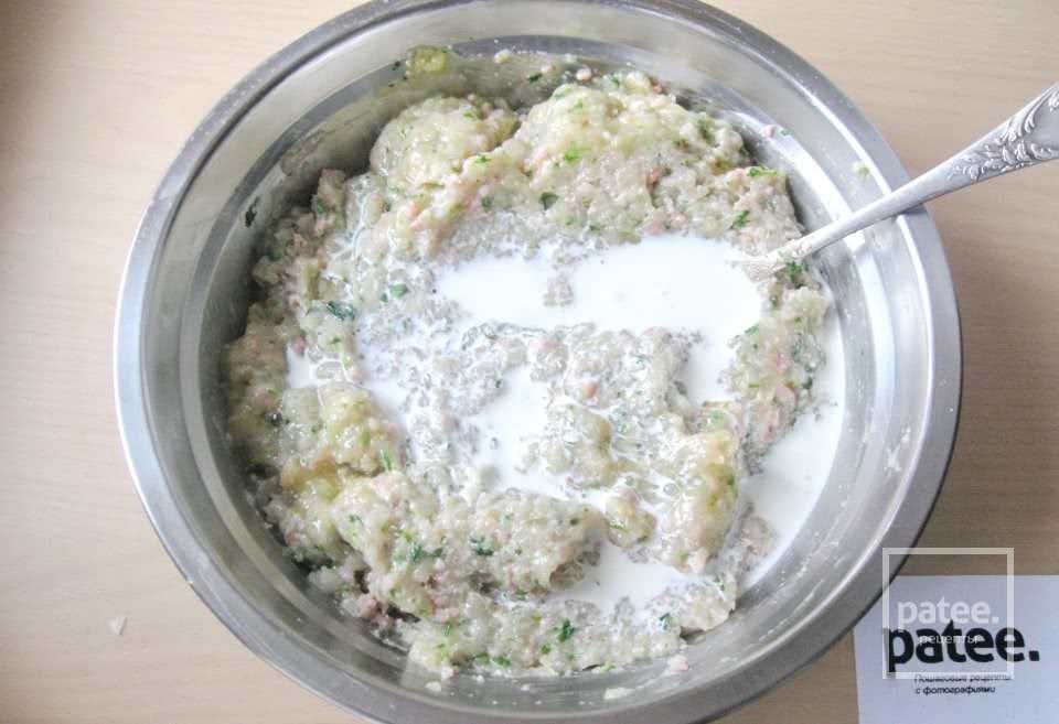 - Желток растирают с мукой и специями. После этого медленно вливают молоко и масло, не прекращая помешивать.