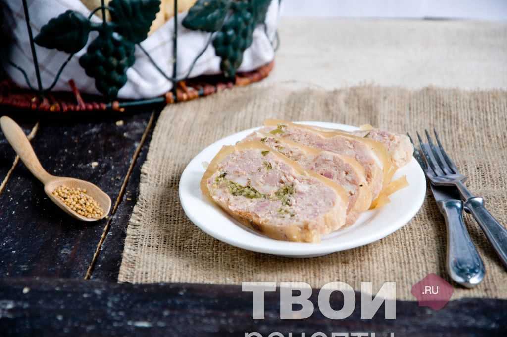 Интересная идея – нарезать галантин после варки некрупными ломтиками, разложить по фигурным кулинарным формам и залить желе из куриного бульона с зеленью.
