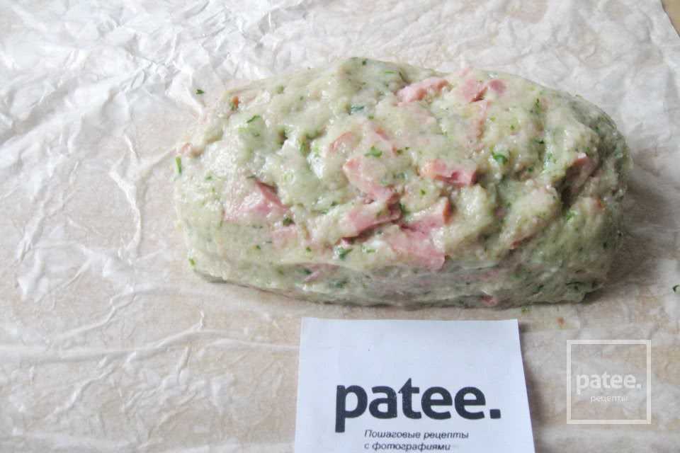 Бумагу для выпечки намочить и воду отжать. Выложить половину фарша на бумагу и сформировать батон.