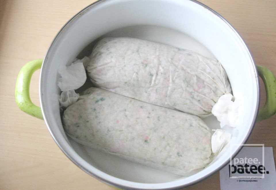 Из указанного количества ингредиентов получается два батона галантина. Кладем их в кастрюлю.