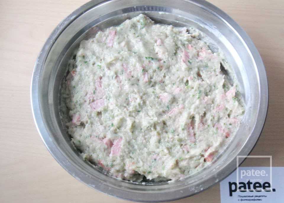 Кладем соль, черный молотый перец по вкусу и перемешиваем куриное филе, репчатый лук, чеснок, зелень и ветчину.