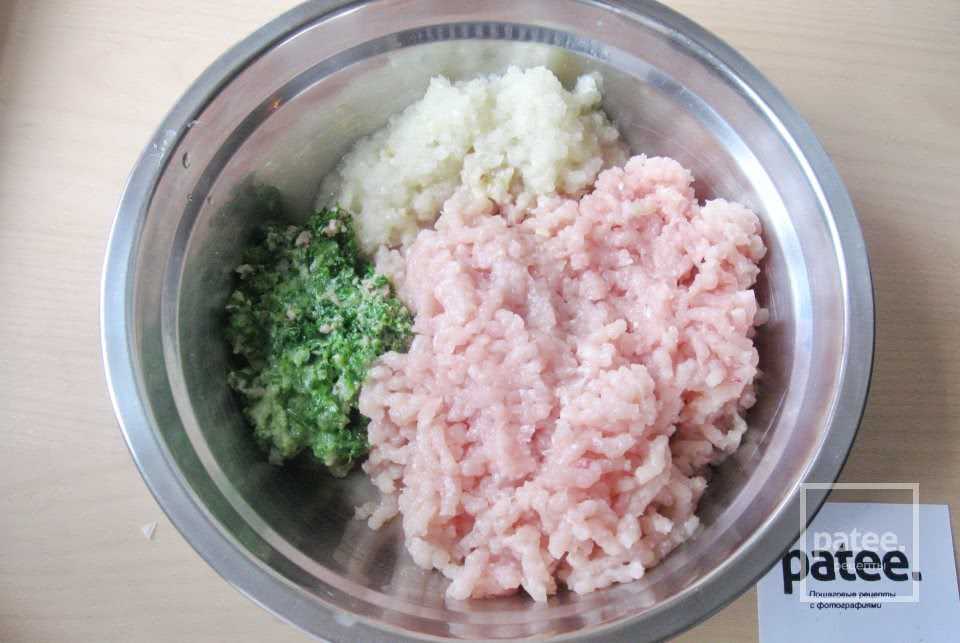 Петрушку или укроп моем и перемалываем через мясорубку. Добавляем к филе куриной грудки, чесноку и луку.