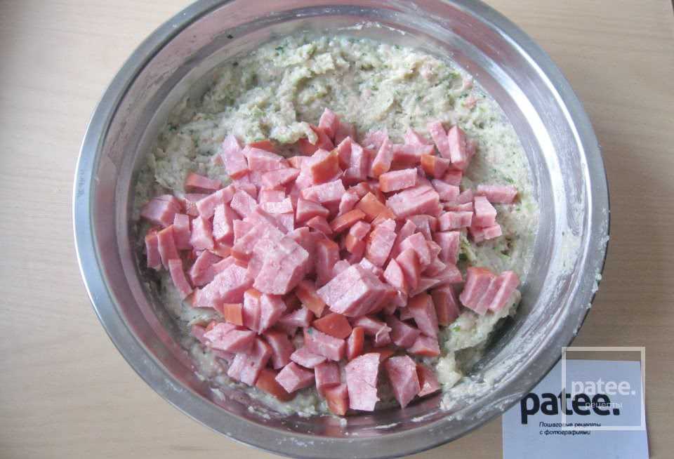 100 грамм ветчины(сервелат) перемалываем через мясорубку. Добавляем к куриному мясу, репчатому луку, чесноку и зелени.