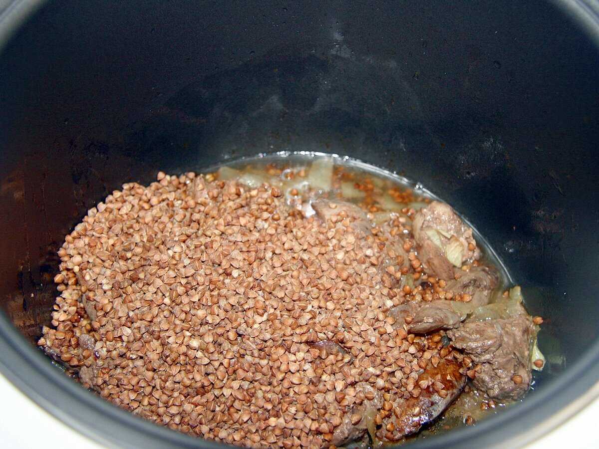 - Приправьте содержимое чаши перцем, посолите. Всыпьте промытую гречку.