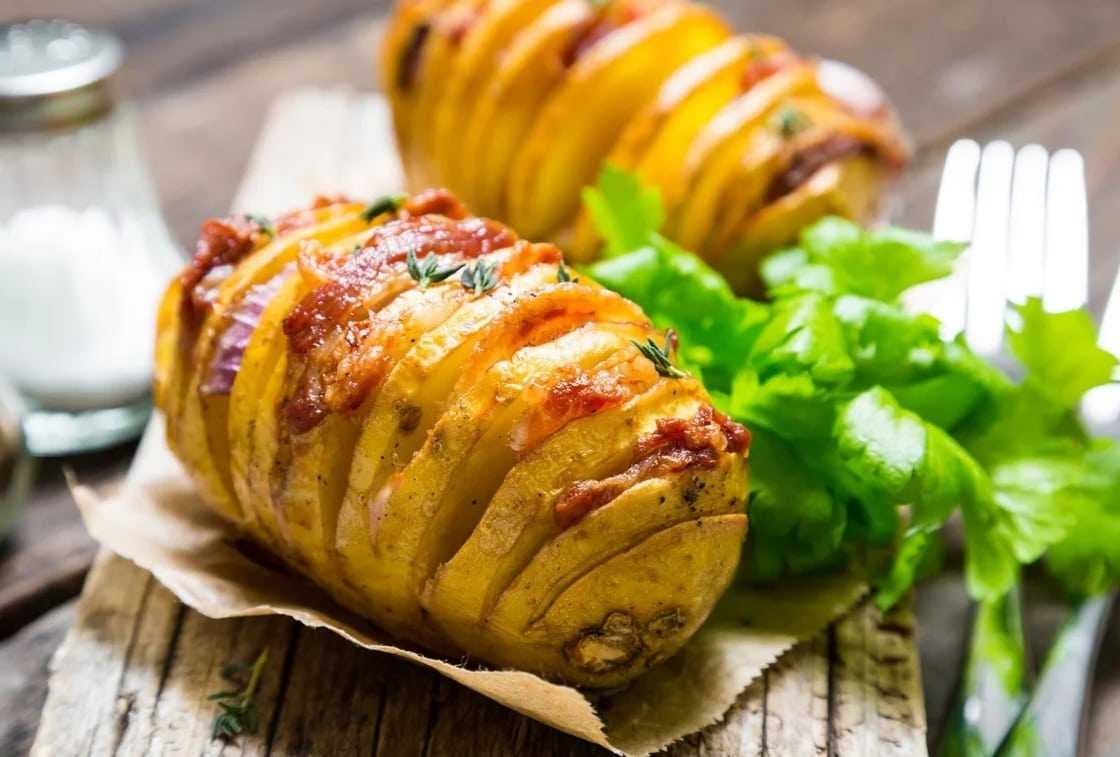 Запечённое сало – это не только вкусная закуска, оно вполне может стать значимым ингредиентом в сытном основном блюде. Беспроигрышный вариант – тандем с картошкой, так называемая «гармошка». Процесс приготовления следующий: