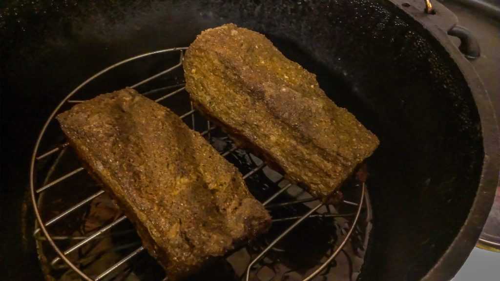 - В казан наливается половина литра воды, 110 мл жидкого дыма. Устанавливается затем решетка, смазанная сливочным маслом.