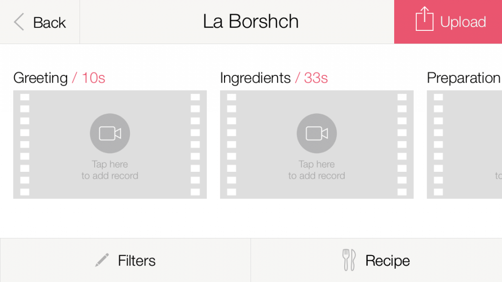 При запуске программа открывает общую ленту, где публикуются рецепты пользователей, которые можно комментировать, «лайкать» и отправлять друзьям. Свайпом из левой части экрана открывается меню, где блюда разделены по разделам для удобства поиска. Вверху расположилась пиктограмма видеокамеры, предназначенная для перехода в «режим видеоблогера»