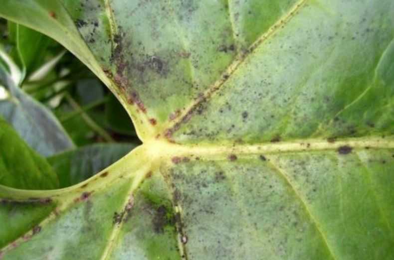 Бактериальная пятнистость – болезнь, проявления которой могут наблюдаться не только на листьях, но и на побегах. В основном этот недуг у Гибискуса вызывают бактерии такого рода, как Xanthomonas. Эта болезнь чаще всего поражает молодые побеги и листья. В зависимости от конкретного вида патогена симптомы заболевания могут несколько отличаться. Наиболее характерная и часто встречающаяся картина – это когда на стеблях и листьях сначала появляются водянистые желтые мелкие пятнышки (видно на фотоснимке), которые постепенно становятся черными. Форма у пятен чаще всего неправильно-угловатая, а по их контуру видна светло-зеленая либо желтая каемка. Пятна постепенно увеличиваются в размерах и затем сливаются. В итоге весь лист становится черным. Так болезнь прогрессирует на всем растении и в конечном итоге оно погибает.