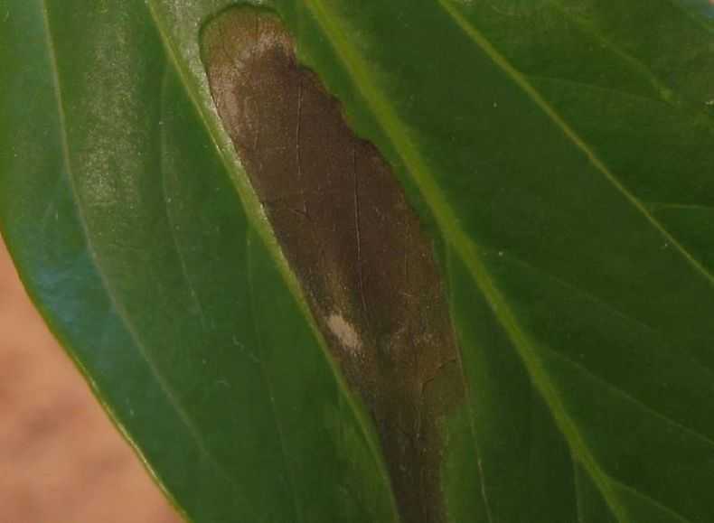 Другой вариант пятнистости, вызванной бактериями – бактериальный ожог. Его возбудителем являются другие бактерии, относящиеся к роду Pseudomonas. Чаще всего бактериальный ожог начинается с молодых побегов, листьев и цветков. Симптомы его следующие. На растении образуются не пятна, а сразу довольно обширные бесформенные участки почернения (как на фото), которые вскоре усыхают. Внешне такие области на листе выглядят так, словно в этом месте он подгорел. Прогрессирование бактериального ожога вызывает сначала отмирание у растения отдельных частей, а потом и его гибель. При благоприятных условиях эта болезнь развивается очень быстро.