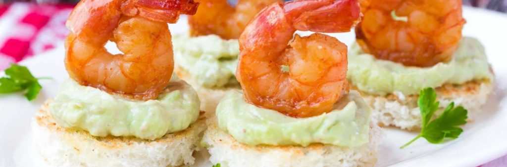 - Намазать багет сырной смесью, добавить нанизанные на шпажку креветку с авокадо;