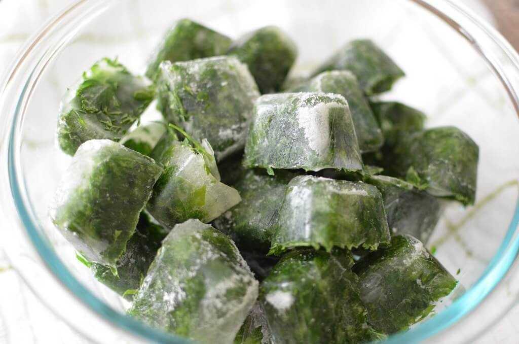 - Мелконарезанные листочки складываются в форму для заморозки и заливаются водой. После полно заморозки подготовленные кубики или иные формы перекладываются в отдельные пакеты.