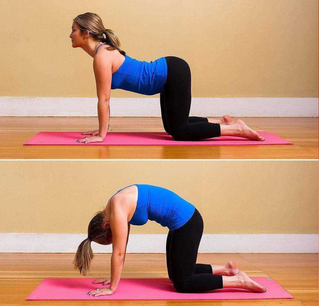 Кошечка. Встаньте на четвереньки. Попеременно медленно выгибайте спину сначала вверх, затем вниз. Прочувствуйте вытяжение спинных мышц. Количество повторений: 10 раз.