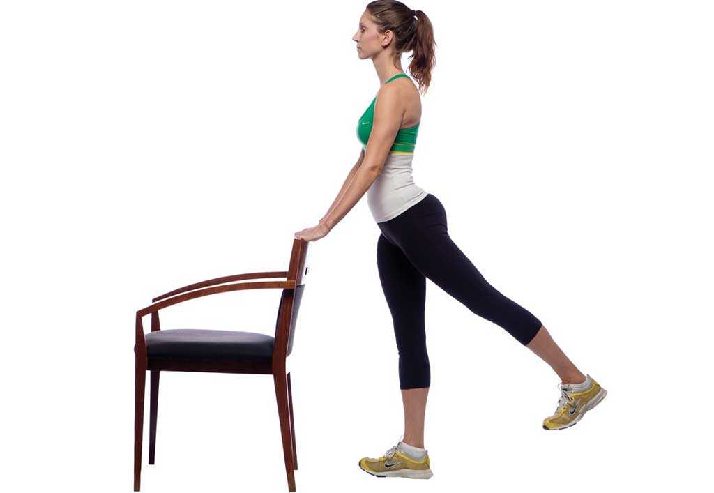 Махи ногами. Оставаясь в положении стоя, обопритесь руками о любую поверхность – к примеру, спинку стула или кресла. Выполните по 10 интенсивных махов назад сначала правой ногой, а затем левой.