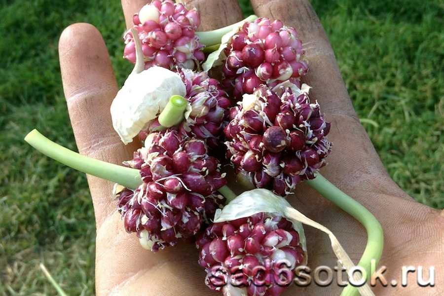 - Для получения посадочного материала стрелки на маточных растениях срезают, как только начнет лопаться внешняя обертка, удерживающая луковички. Стрелки связывают в пучки и развешивают в прохладном месте на дозаривание.