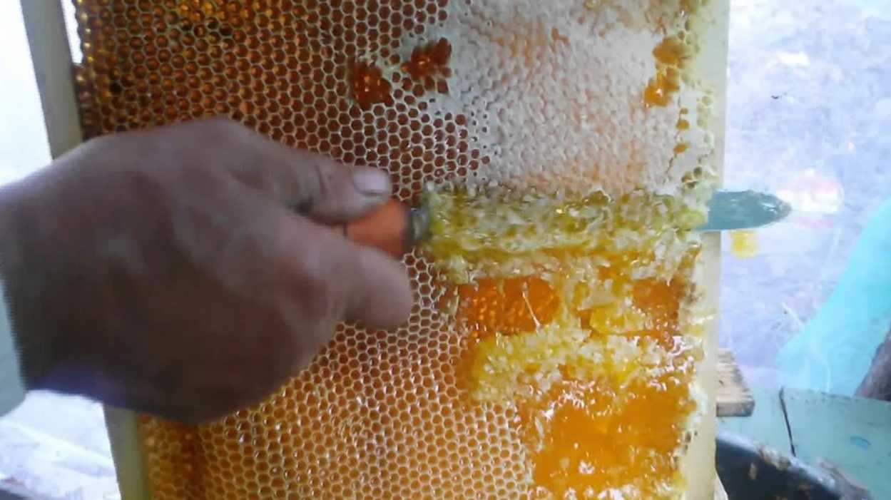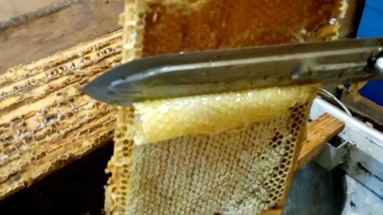 После изъятия всех рамок, улей прикрывают. Ножом обрезают верхнюю часть ячеек. Чтобы облегчить работу, нож можно нагреть. Освобожденные от насекомых соты отвозятся на место, где будет происходить откачка.