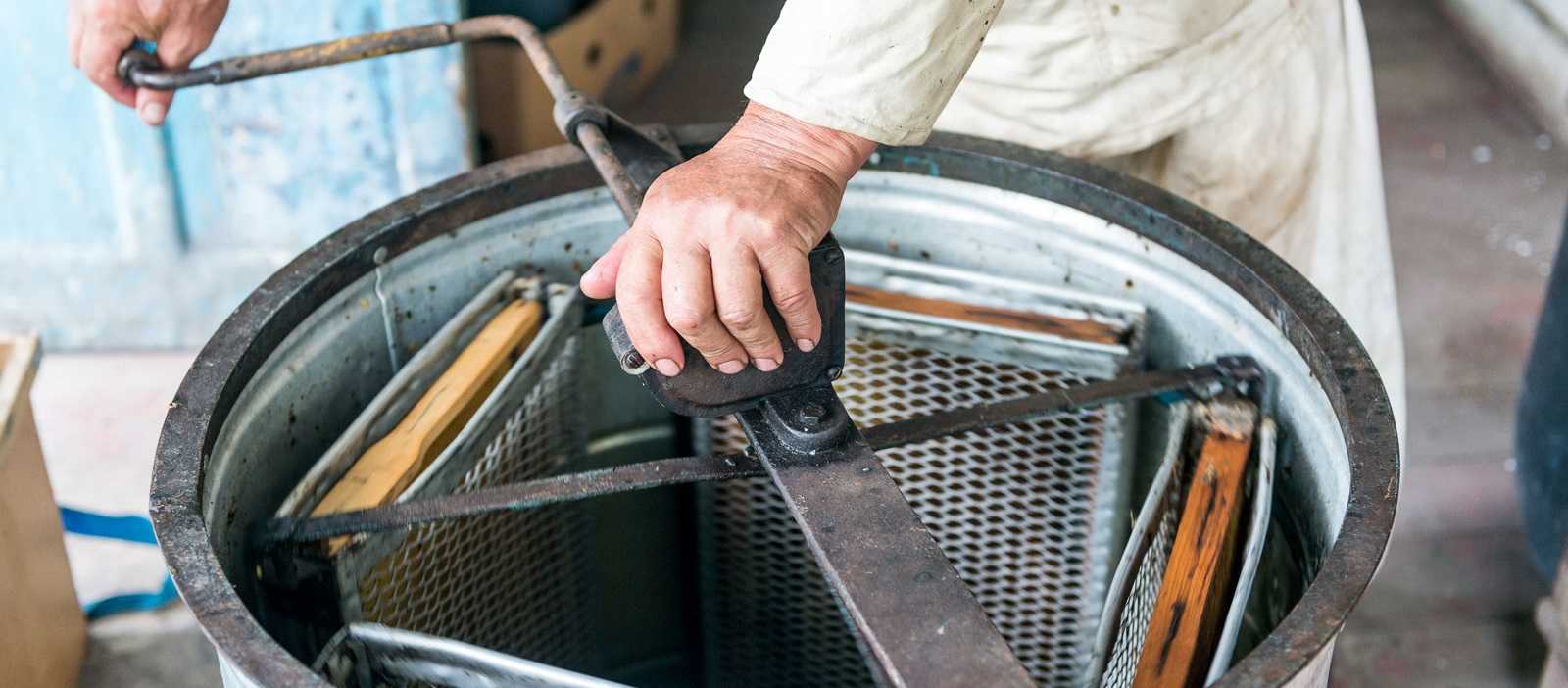 Как производится откачка пчелиного меда с помощью медогонки на пасеке?