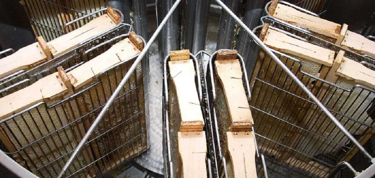 После распечатки рамок с помощью ножа на специальном столе, их загружают в заранее установленную медогонку вскрытой стороной наружу. Размещать их нужно симметрично, чтобы не возник перевес и чрезмерная вибрация.