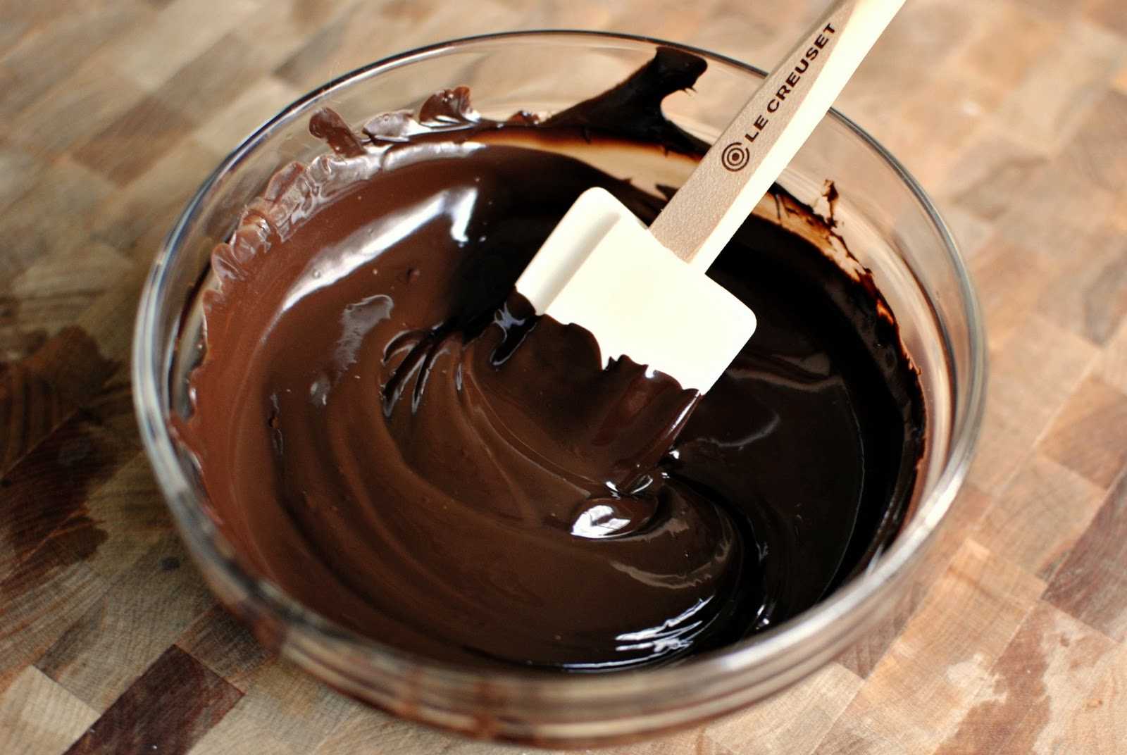 Сняв с огня, добавляем 250 г. измельченного шоколада (желательно черного). Медленными круговыми движениями помешиваем шоколад до полного растворения. Присоединяем 80 г. мягкого сливочного масла или его заменителя, например, качественный спред. Тщательно разбавляем в сливочно-шоколадной смеси. Добавляем 40 мл. коньяка для придания аромата. Также аккуратно размешиваем.