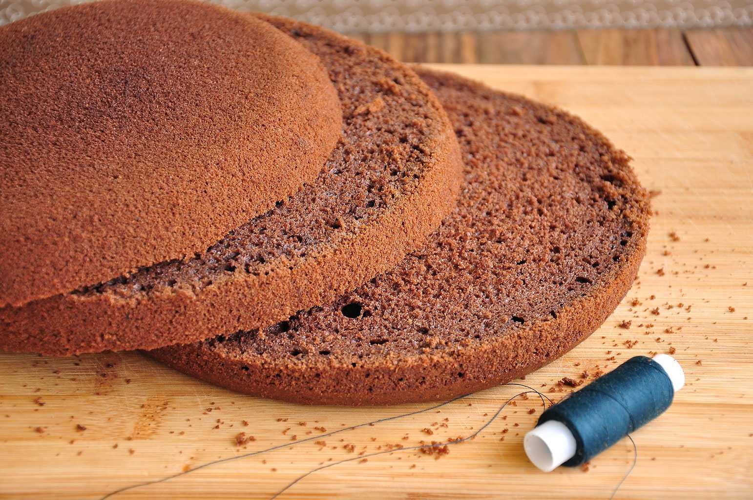8. Как только бисквит полностью остынет, разрезаем его на три коржа.