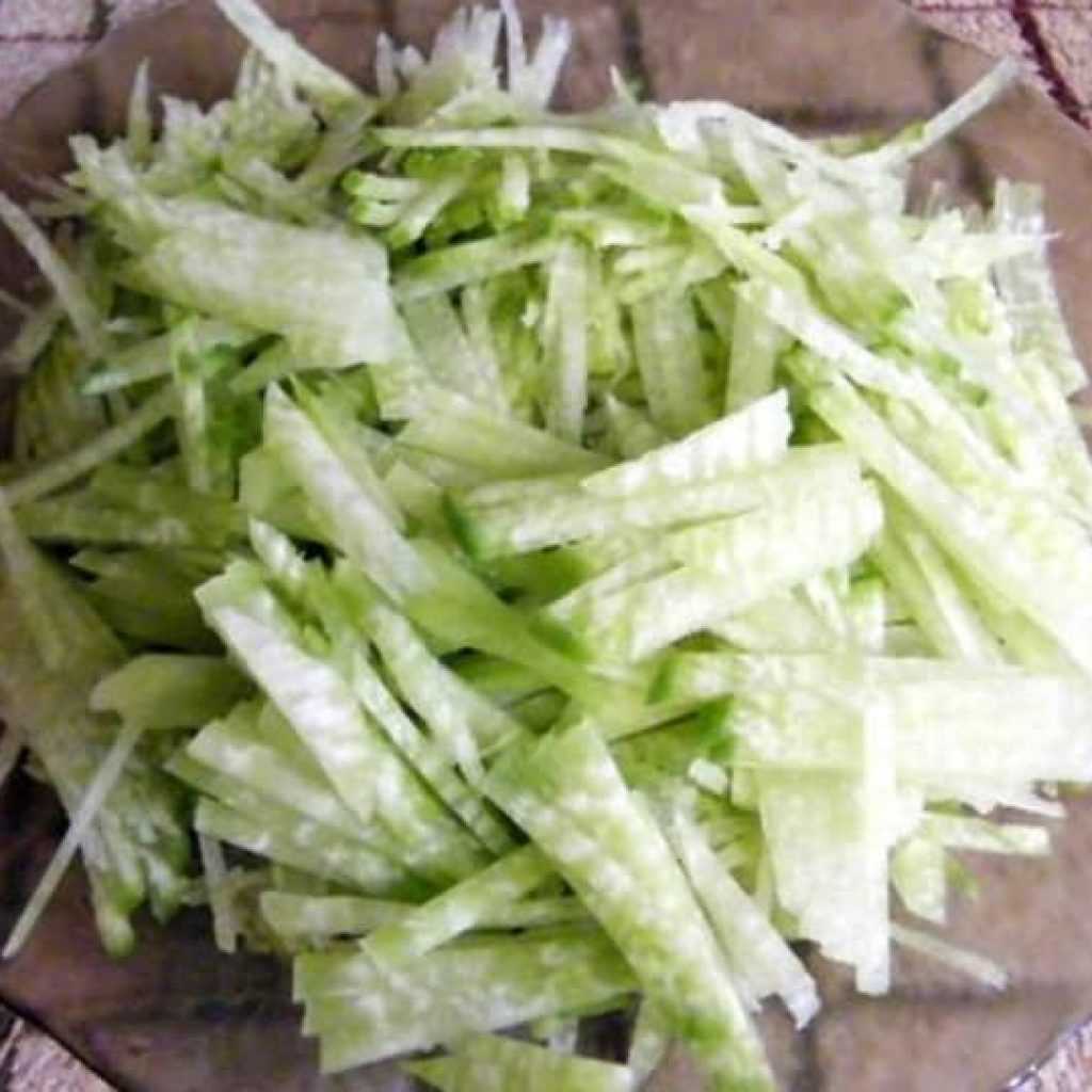 - Редьку вымоем, очистим от кожуры и нарежем небольшими кубиками.
