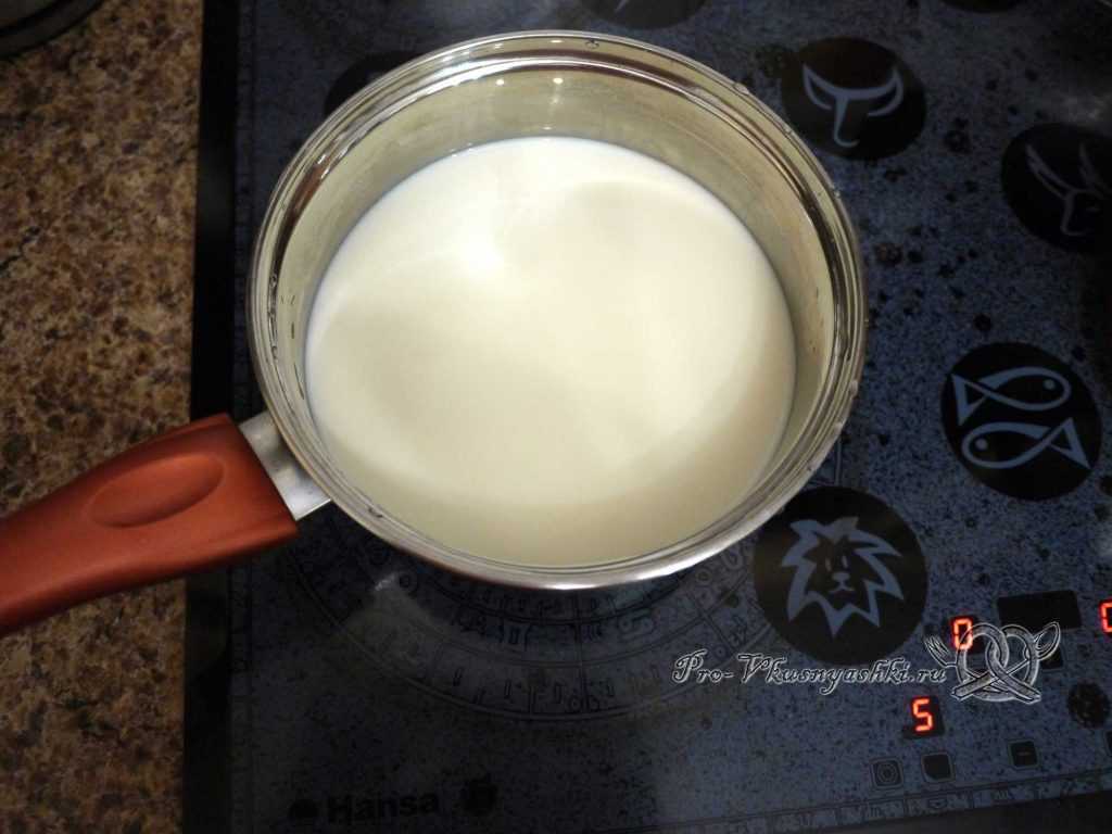 В это же время ставим на средний огонь молоко и нагреваем до 40 С. Его готовность можно проверить пальцем, если почувствовали небольшое тепло, значит пора снимать сотейник с плиты.