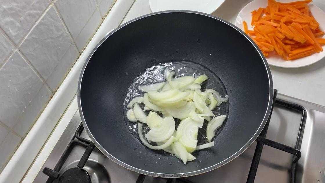 - Нарежьте лук полукольцами. Поджарьте его до золотистого цвета.