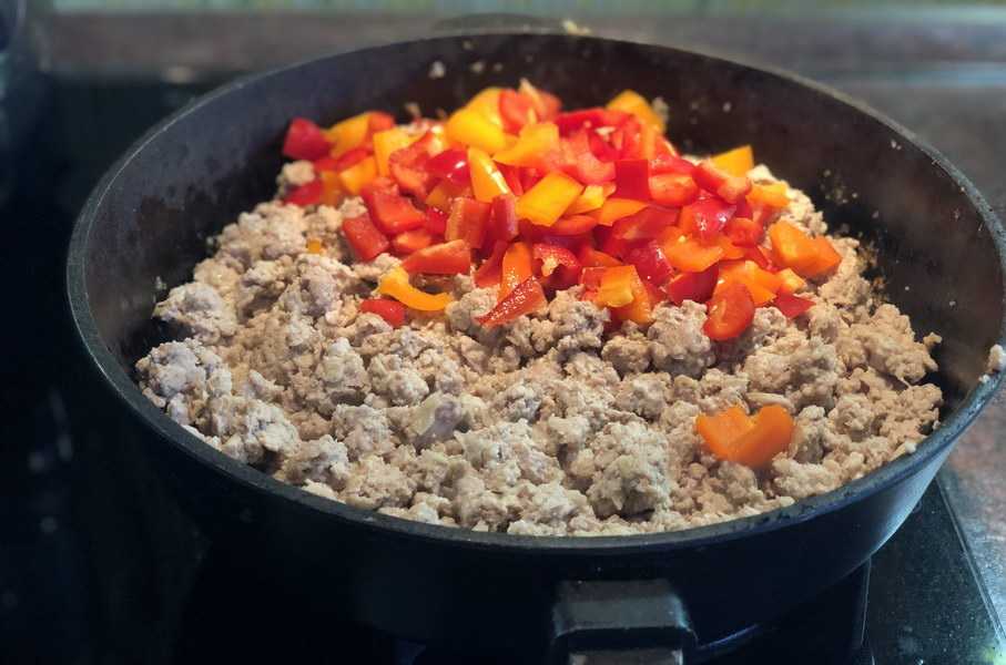 Мясная начинка. Возьмите любой фарш или колбасные изделия, при желании добавьте мелко нарезанные овощи. Ингредиенты обжариваются со специями, потом тушатся минут 15 с помидорами в собственном соку или с томатной пастой. Классический вариант — это говяжий фарш, дополненный томатами.