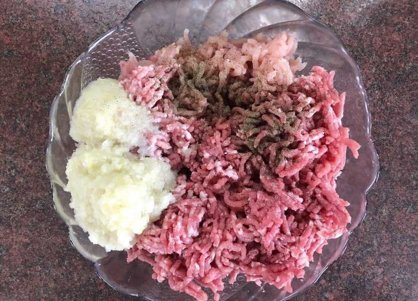 Для фарша я взяла смесь свинины и курицы. Мясо можно взять абсолютно любое, которое нравится. Мясо необходимо покрутить в мясорубке с одной луковицей