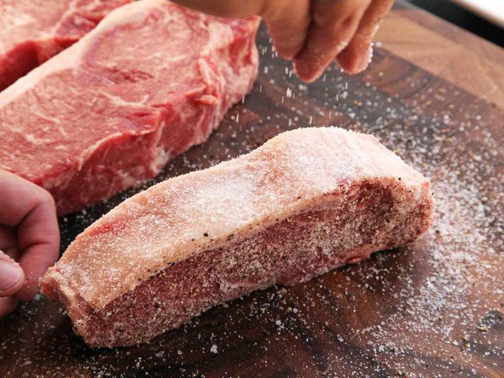Если вы приобрели специальный шкаф для выдержки мяса — у вас не будет проблем, кроме покупки правильного куска говядины. А вот в обычном холодильнике правильная ферментация мяса методом сухой выдержки затруднена — в нем нет контроля влажности и циркуляции воздуха. Но если обильно посыпать стейк обычной солью, то это будет препятствовать развитию бактерий и вытянет из него излишнюю влагу. Посыпанные солью куски мяса необходимо обернуть марлей и положить на решетку. Хранить такой стейк можно не более 3 суток при температуре 4 °С.