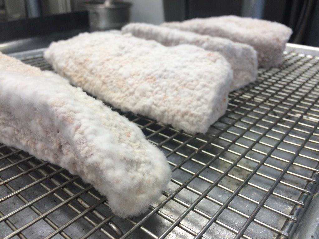 Но стоит учесть, что при этом способе выдержки мясо теряет до 20-30% своего первоначального веса, дополнительно после сухой выдержки приходится срезать верхнюю обсохшую корку с грибками, которые так же содействуют процессу ферментации и усиления вкуса мяса. Все это существенно удорожает конечный продукт.