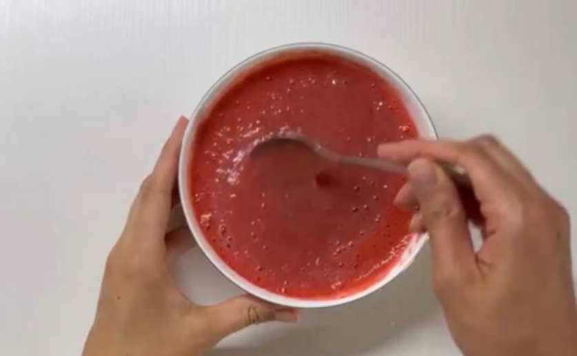 - Подогреем вишневый сок и растворим в нем оставшуюся часть желатина. Выльем сок в форму.
