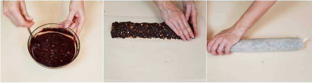 Добавьте влажную шоколадную смесь к измельченным сухарям и сухофруктам и хорошо перемешайте до однородности. Когда тестовая основа будет готова, оставьте ее на столе, чтобы приготовить крем.