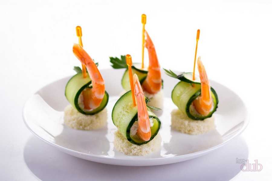 - Сверху на кусочек огурцы поместите салатные листья и проткните их шпажками с креветками.
