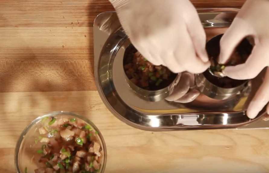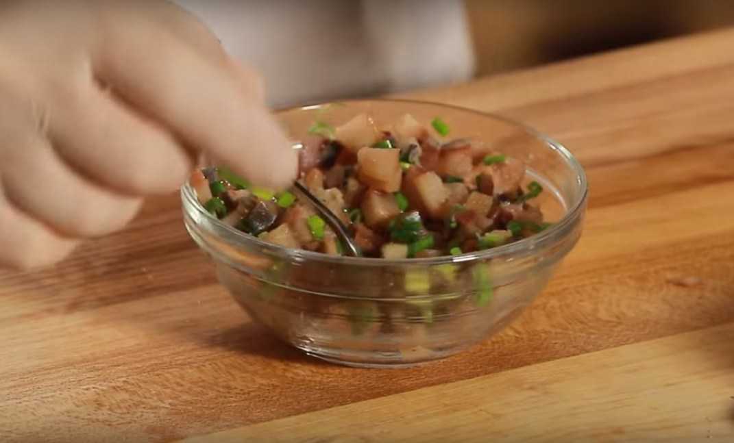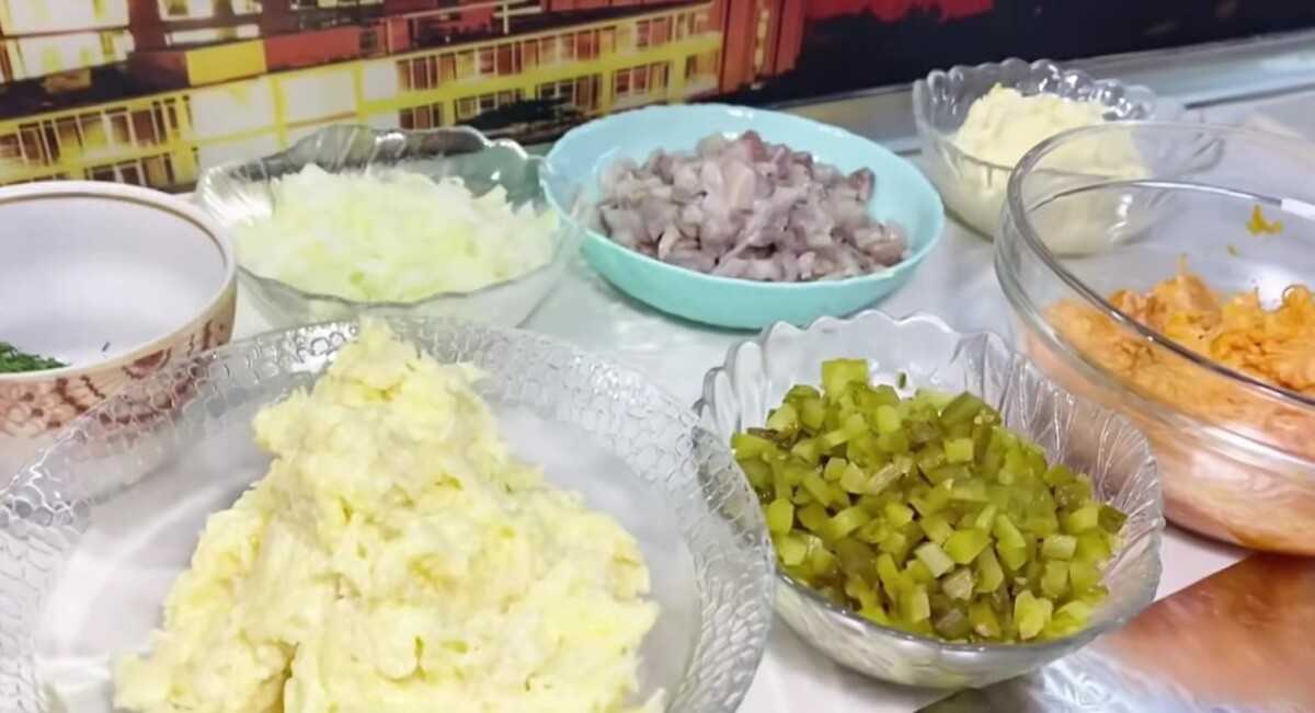 Все продукты нужно сварить, кроме лука – его необходимо замариновать в кипятке с добавлением уксуса или пожарить. А когда все готово, можно приступать: