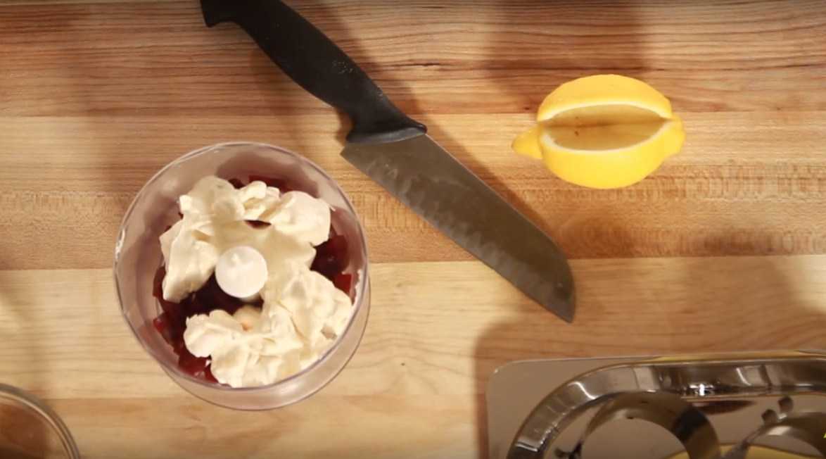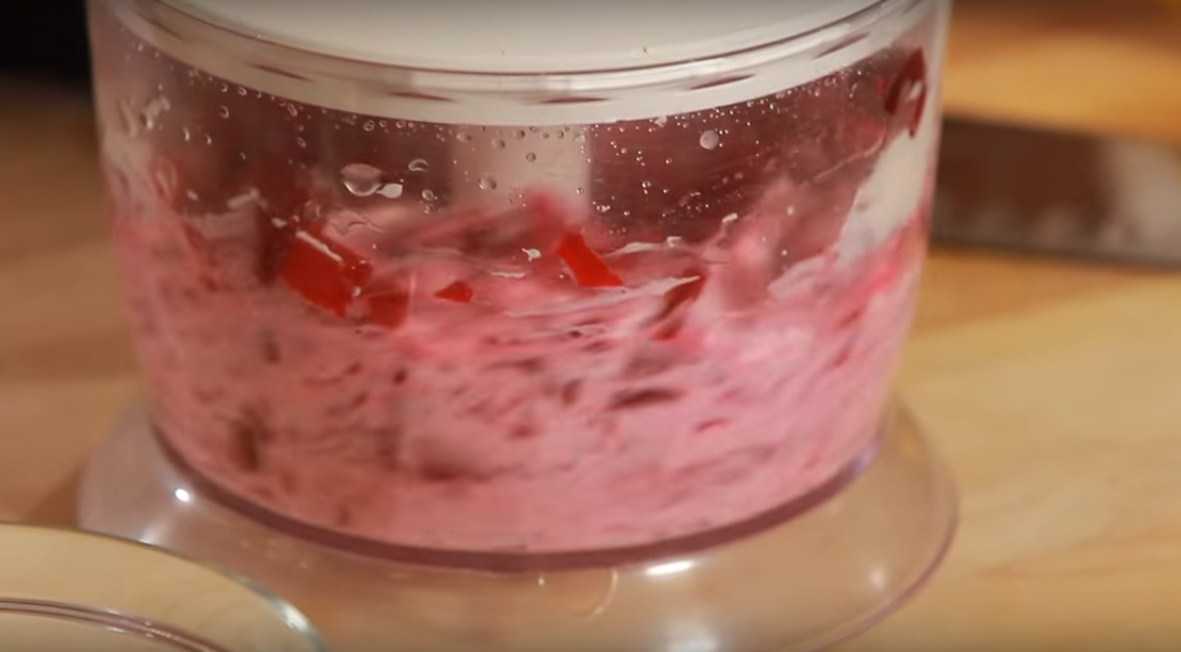 7. Вы наверное заметили, что в составе салата нет свеклы. Это и есть наша необычная глазурь покрывающая верхушку селёдки под шубой. Варёную свёклу нарежьте на кусочки и поместите в блендер. В ту же чашу добавляем майонез, соль и чёрный перец по вкусу. Всё измельчаем до однородного состояния.